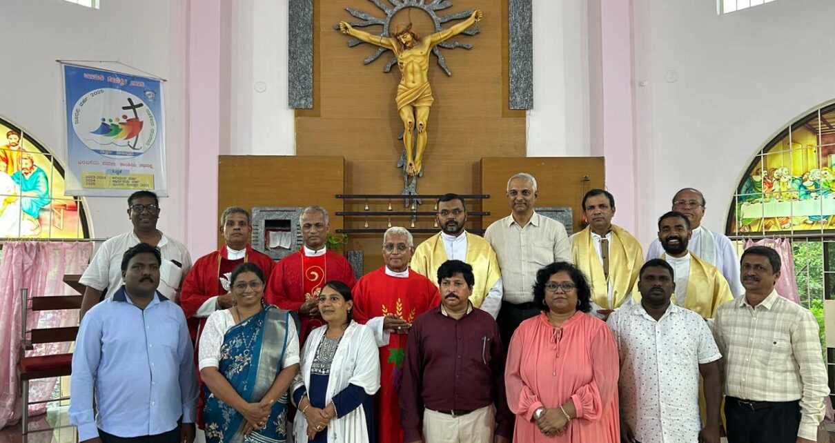A highlight of the day was when Most Rev. Dr. Robert Miranda, Bishop of Gulbarga, blessed the newly formed team by laying hands on them, invoking the gift of the Holy Spirit. The celebration concluded with the Holy Eucharist, during which the Bishop reflected on the complete self-offering of Jesus—His head, hands, legs, and heart—and invited the faithful to examine themselves with the question: “Where are we standing?”